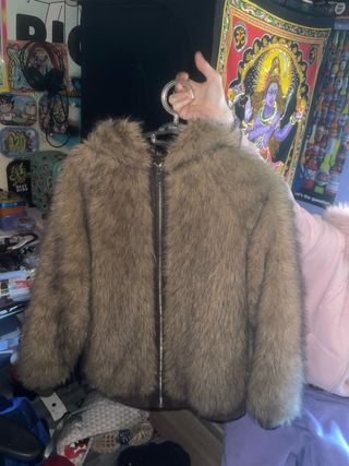 Elegante abrigo de pelo sintético en color marrón. Una prenda cálida y con estilo. Es oversize por lo que también vale si usas una talla L normalmente. Está nuevo a estrenar con la etiqueta. Tengo el ticket, en tienda cuesta 80€ - Diseño con cuello ancho. - Manga larga. - Bolsillos laterales.