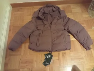 Abrigo largo acolchado de polipiel. Diseño moderno y elegante. Capucha con cordones. Cierre de cremallera frontal. Marca Zara Nuevo, sin usar Talla L Medidas: 64cm de sisa a sisa. 78cm de largo.