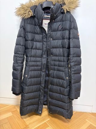Abrigo plumífero largo de Tommy Hilfiger en color negro. Cuenta con capucha y detalles de pelo sintético. - Cierre de cremallera. - Bolsillos laterales con botones. - Diseño acolchado. Me costó 265€ en El Corte Inglés