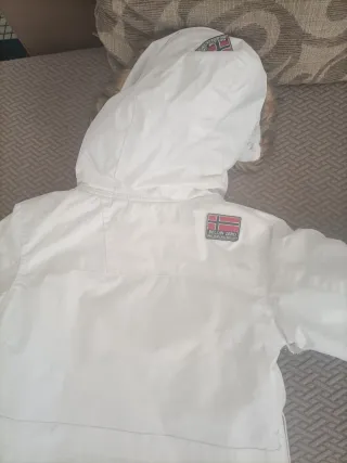 Abrigo Geographicals Norway en color blanco, talla 10 años. Ideal para el frío. - Capucha con pelo. - Bolsillo frontal grande. - Cierre de cremallera y botones. - Diseño con parches y logo.