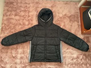 Abrigo acolchado de la marca Adidas. Presenta un diseño moderno y deportivo. - Diseño acolchado. - Rayas blancas laterales. - Capucha integrada.