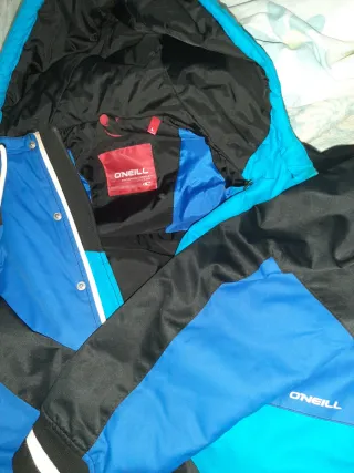 Abrigo de la marca O'Neill con un diseño moderno y llamativo. Talla L - Combinación de colores azul y negro. - Capucha integrada. - Cierre de cremallera y botones a presión. - Puños elásticos con detalles blancos.