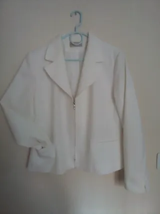 Chaqueta elegante de color blanco para mujer. Talla 48 - Cierre de cremallera frontal. - Bolsillos laterales. - Cuello solapa. Forrada MUY NUEVA USADA UNAS HORAS LAVADO Y PLANCHADO Se entrega en persona Visita mi página para ver otras ofertas