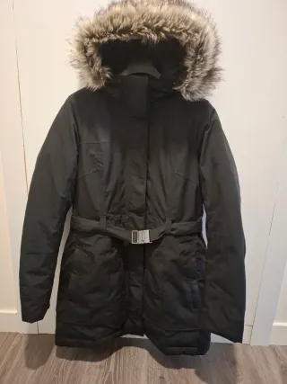 Parka de invierno The North Face en color negro. Cuenta con un cinturón ajustable en la cintura y una capucha con pelo. - Capucha con detalle de pelo. - Cinturón con hebilla metálica. - Diseño acolchado. Usado poquisimo por embarazo y cambio de talla.