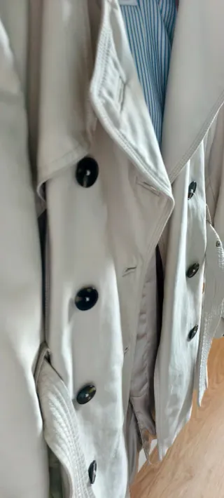 Chaqueta de la marca Zara en color beige. Presenta un diseño clásico y elegante. - Cierre de doble botonadura. - Cinturón ajustable a la cintura. - Cuello solapa. - Bolsillos frontales.