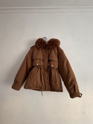 Chaqueta acolchada con capucha y detalles de pelo. - Cierre con cremallera. - Cintura ajustable con cordón. - Bolsillos frontales con solapa. - Puños abotonados.