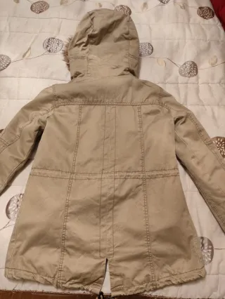 Abrigo calentito de color verde, ideal para el frío. - Capucha con pelo. - Cierre de cremallera y botones. - Bolsillos delanteros con solapa. - Cintura ajustable con cordón.