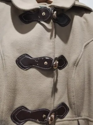 Abrigo corto de tela con capucha (se puede quitar) y detalles de polipiel. - Cierre con botones. - Bolsillos delanteros. - Mangas abullonadas. Único defecto en la polipiel de los botones un pelin levantado alguna zona. Por eso el precio.