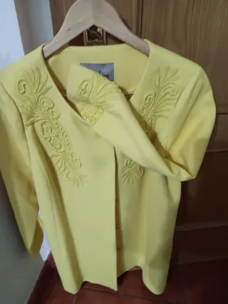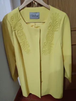 Elegante abrigo de primavera en color amarillo. Presenta un diseño con detalles bordados en la parte delantera. - Cierre de botones. - Mangas tres cuartos. - Cuello redondo.