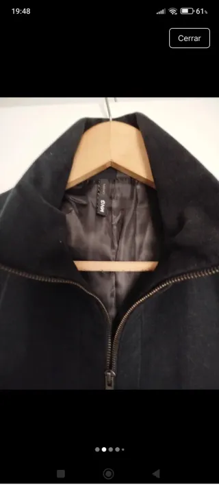Abrigo elegante de color negro. En perfecto estado. Muy versátil - Cierre frontal con cremallera. - Dos bolsillos con cremallera. - Cuello alto.
