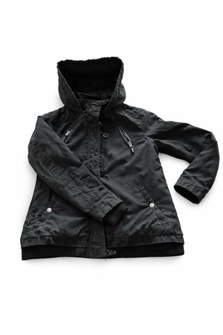 Cazadora anorak abrigo de la marca adolfo dominguez - Diseño en color negro. - Talla 38 (equivalente a M / 10). con hebilla y tiradores doradis con el nombre de la marca