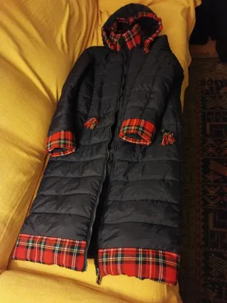 Abrigo largo sintético con un diseño acolchado y detalles a cuadros escoceses. - Forro interior de capucha con estampado de cuadros. - Puños con vuelta y detalle de cuadros escoceses. - Ribete inferior con estampado de cuadros escoceses. - Cierre frontal con cremallera.