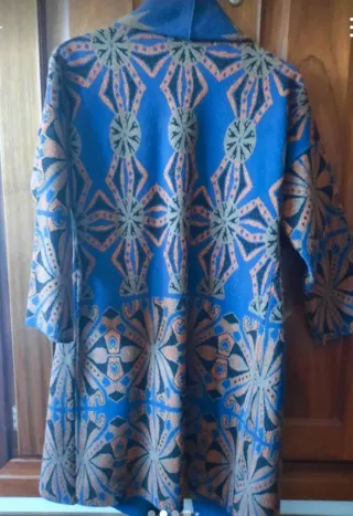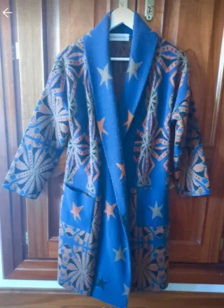 Abrigo estilo levita con un diseño llamativo. - Estampado de estrellas y motivos geométricos. - Diseño abierto con solapas. - Bolsillos frontales.