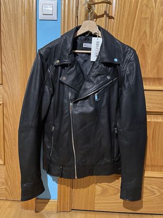 Cazadora de cuero para hombre, con un diseño clásico y atemporal. - Material: Cuero - Color: Negro - Estilo: Motero - Cierre: Cremallera - Bolsillos: Varios con cremallera La cazadora esta nueva, la compre por internet y me queda pequeña pero se me paso el plazo de devolución.