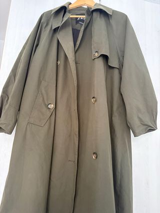 Gabardina de Zara en color verde. - Diseño clásico. - Cierre de botones. - Bolsillos frontales. Oversize Puesta un dia Tiene trabillas pero no tenia cinturon, es asi
