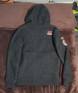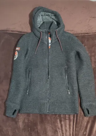 Abrigo Superdry de punto grueso con capucha. - Cierre de cremallera frontal. - Dos bolsillos laterales con cremallera. - Puños con abertura para pulgar. - Detalle de cordones en la capucha.