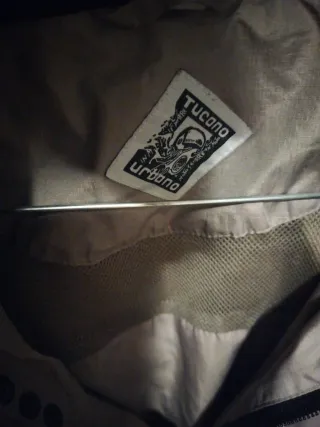 Chaqueta Tucano Urbano de color beige con detalles en negro. Ideal para protegerse de la lluvia. - Diseño moderno y funcional. - Cierre de cremallera y botones. - Bolsillos frontales con solapa. - talla XL. -