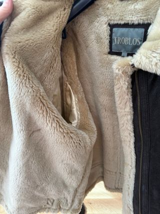 Abrigo acolchado con forro interior de borreguito. - Cierre de cremallera y botones a presión. - Bolsillos laterales con cremallera. - Capucha con detalle de pelo. Usado 3 veces esta nuevo precio en tienda 100€