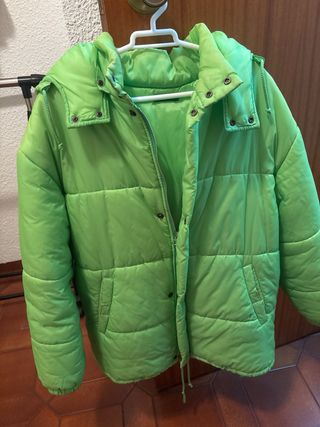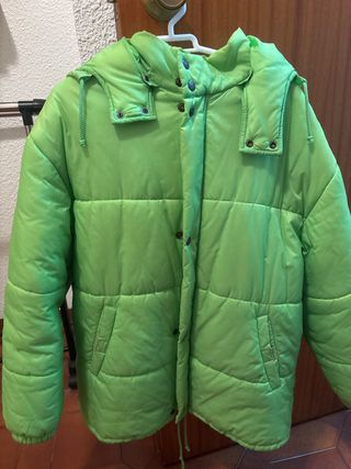 Plumífero de color verde pistacho, ideal para mantenerte abrigado. - Capucha ajustable con cordones. - Cierre de botones a presión. - Bolsillos laterales. - Diseño acolchado.