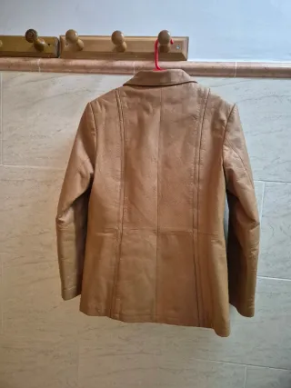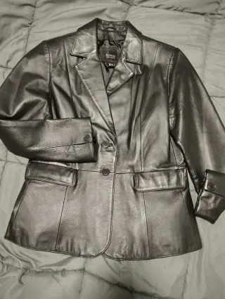 Elegante chaqueta de cuero estilo blazer. - Diseño clásico con solapas. - Cierre de dos botones. - Dos bolsillos frontales con solapa. - Puños con detalle de botón.