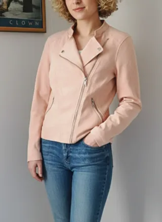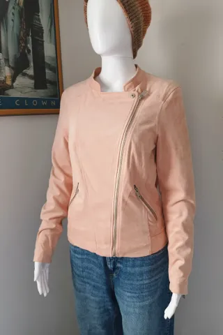 Chaqueta estilo biker confeccionada en antelina de color rosa. Presenta un diseño asimétrico con cremallera. - Cuello mao. - Cierre asimétrico con cremallera. - Bolsillos frontales con cremallera. - impecable condición, usada muy poco. #Marijose00closet #bikermujer3638