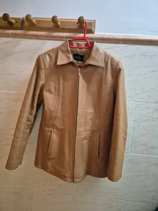 Chaqueta de cuero en tono marrón, con un diseño clásico y elegante. - Cierre de cremallera frontal. - Cuello camisero. - Bolsillos laterales.