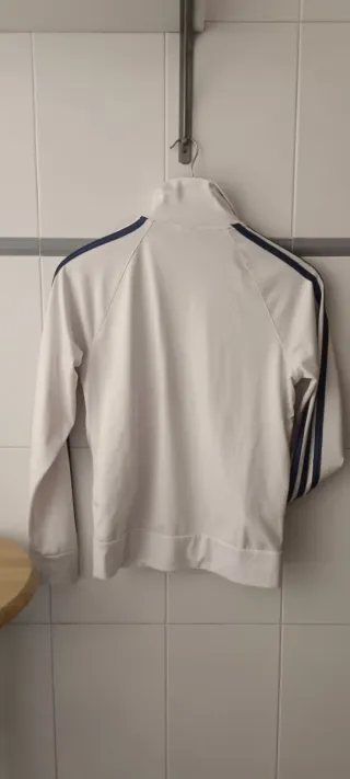 Chaqueta deportiva de la marca Adidas. - Diseño con franjas azules en las mangas. - Logo de Adidas en el pecho. - Cremallera frontal. - Bolsillos laterales con cremallera.