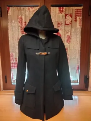 esta usado y tiene marca en el brazo.Abrigo azul con cierre de cordones y botones de madera.❌envios por Seur,inpost,correos,otros no mando❌ - Diseño tipo duffle coat. - Dos bolsillos frontales. - Capucha integrada.