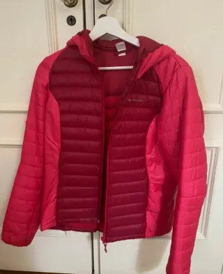 Chaqueta con capucha de la marca Quechua, perfecta para actividades al aire libre. Talla M/L - Diseño acolchado. - Combinación de colores rosa y rojo. - Cierre de cremallera frontal.