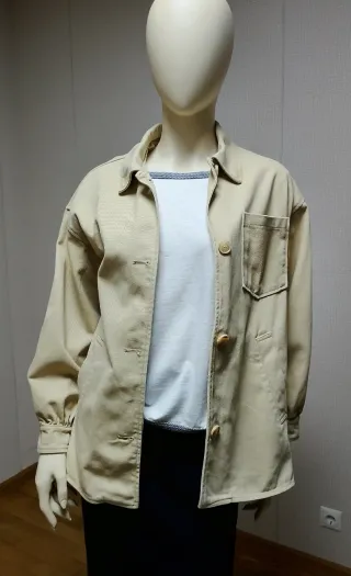 Chaqueta de la marca Pull&Bear en color beige. Presenta un diseño moderno y versátil. - Cierre de botones. - Bolsillo en el pecho. - Puños ajustados. Talla 13- 14 , pero es muy completa , ancho de hombros 52 cm, ancho de sisa 54 cm, largo de manga 51 cm, largo total 66 cm.