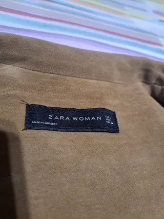 Abrigo de mujer de la marca Zara.Cierre de botones y con bolsillos a lis lados.Usado en buen estado.Mide 61 cm de manga,30 cm de ancho,47 cm de pecho y 83 cm de largo.el.tejido es algod9n y viscosa. - Color marrón. - Forro interior a rayas.