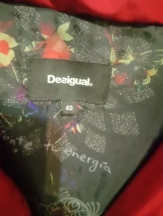 Abrigo original Desigual ❤️ Color rojo intenso, diseño acolchado y forro interior estampado típico de la marca. ✨ Detalles: ✔ Talla 40 ✔ Capucha ✔ Bolsillos con cremallera ✔ Muy cómodo y calentito ✔ Corte muy favorecedor 📌 Estado: En muy buen estado general. ⚠ Tiene un pequeño roto cerca de un bolsillo (ver foto). No afecta al uso ni a la estructura del abrigo. Por lo demás, está perfecto. Ideal para otoño / invierno. Una prenda preciosa de Desigual a precio reducido.
