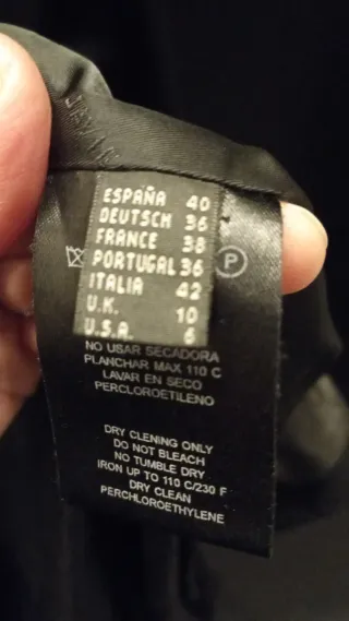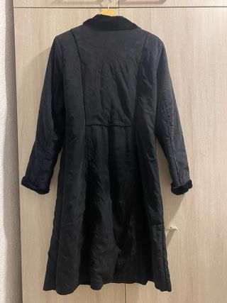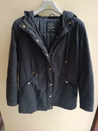 Abrigo de Sfera, es abrigado, tipo acolchado. Marca talla L, pero sería más bien XL (42) o L amplia y cómoda. En muy buen estado. El enganche de la cremallera acortado (ver foto) pero se puede subir y bajar sin problema. Color negro con botones y cremallera en dorado con algún desgate del uso. MEDIDAS en últimas fotos