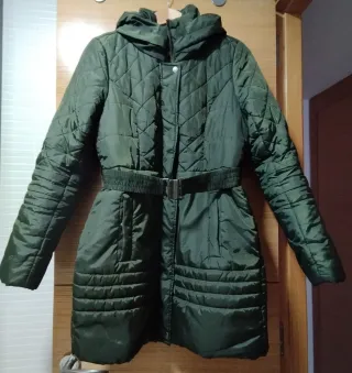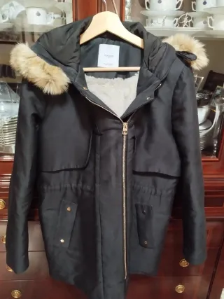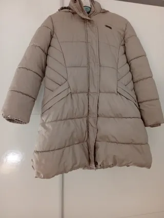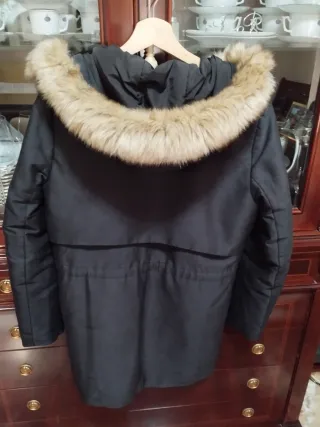 Abrigo acolchado con capucha de pelo sintético desmontable. Cierre de cremallera frontal. Bolsillos laterales. Forro interno. SÓLO VENTA EN MANO.