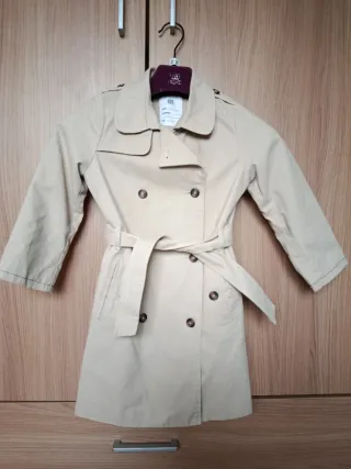 Abrigo estilo trench para niña, perfecto para entretiempo. Diseño clásico y elegante. - Doble abotonadura. - Cinturón para ajustar. - Bolsillos laterales. Las mangas se han ajustado DM para la medida. Se usó muy poco. Todavía bien estado.