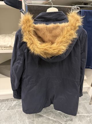 Abrigo tipo parca de color mostaza con gorro. - Capucha con pelo sintético. - Cierre de cremallera y botones. - Cordón ajustable en la cintura. - Bolsillos frontales. - Un bolsillo viene más pequeño por defecto de fábrica, los demás están perfectos.