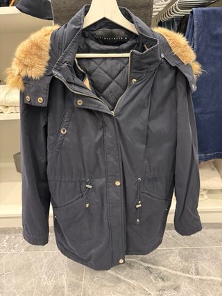 Abrigo azul marino con capucha y detalle de pelo. - Capucha con pelo. - Cierre de cremallera. -interior con forro de pelo