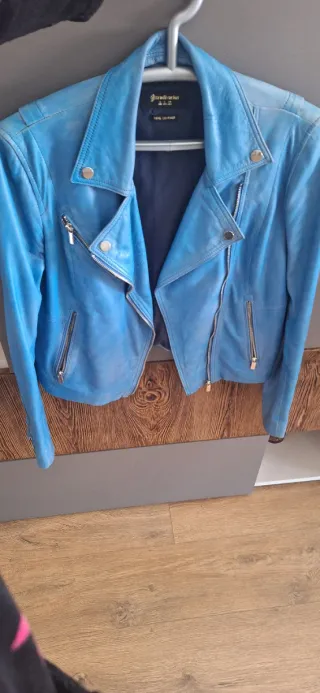 Chaqueta de cuero para mujer en un llamativo color azul. Un básico de armario con un diseño moderno. efecto desgastado - Cierre de cremallera. - Bolsillos frontales con cremallera. - Cuello solapa con botón a presión.