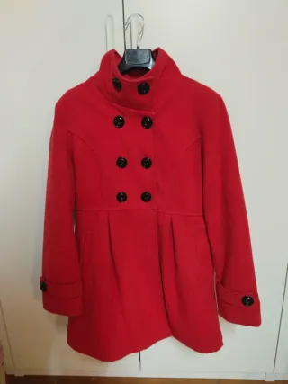 Elegante abrigo de paño en color rojo, perfecto para añadir un toque de estilo a tus conjuntos. - Diseño de doble botonadura. - Cuello alto. - Puños con detalle de botón. - Bolsillos laterales.