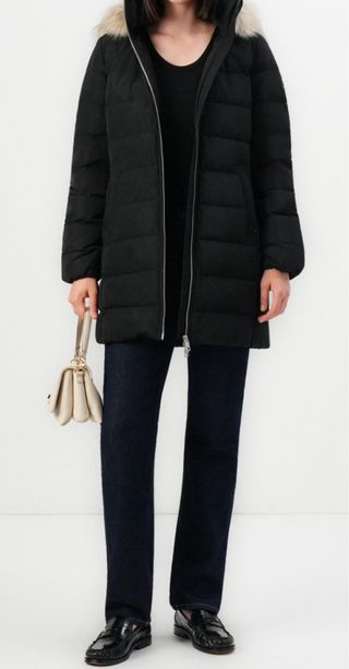 Cazadora acolchada con capucha y pelo sintético. - Cierre de cremallera. - Bolsillos laterales con cremallera. - Acabado brillante.SE HA USADO UNA VEZ..