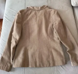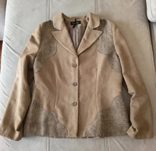 Elegante chaqueta de la marca Lazada - Diseño en color beige con detalles en marrón. - Talla M (38/10). - Acabado tipo ante con inserciones texturizadas. Medidas hombros 38 cm,de sisa a sisa 52 cm y largo 63 cm