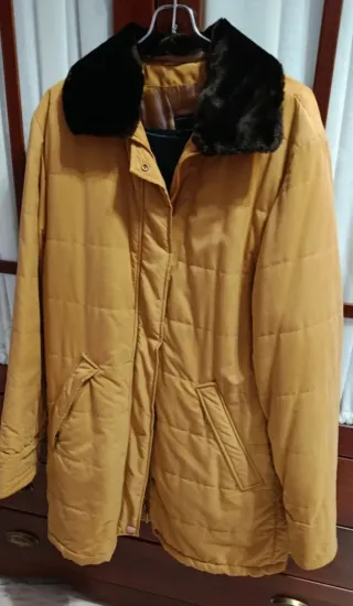Abrigo acolchado con un elegante cuello de pelo sintético. - Color mostaza. - Cierre de cremallera y botones. - Dos bolsillos delanteros.