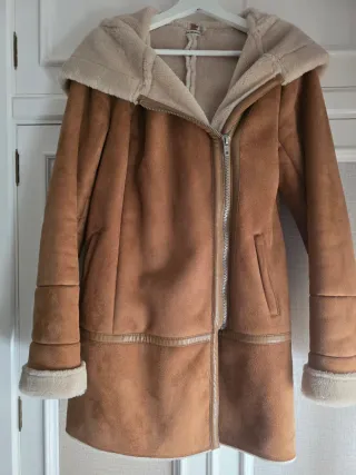 Abrigo estilo aviador con doble faz y detalles de pelo. - Cierre asimétrico con cremallera. - Cinturón con hebilla en la cintura. - Bolsillos frontales con cremallera. - Cuello y puños con pelo sintético. - Usada una vez. Como nueva.