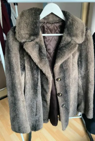 Abrigo vintage con un diseño de pelo en tonos marrones y grises. Presenta un forro interior acolchado y cierre de botones. Tiene un corte elegante, cuello amplio y forro interior acolchado que abriga muchísimo. Ideal para otoño e invierno ❄️✨ Recrea looks casuales o más arreglados. Queda espectacular con vaqueros, vestidos o botas altas.