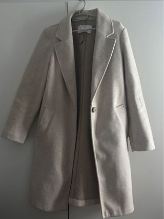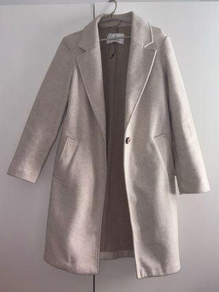 Abrigo largo de Zara en color beige. Presenta un diseño elegante y moderno. - Cuello solapa. - Cierre de botón. - Bolsillos laterales.
