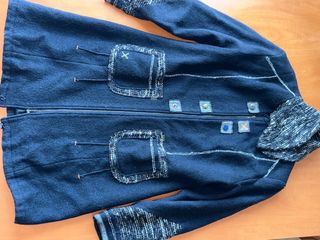 Abrigo largo con un diseño único y detalles llamativos. - Bolsillos frontales con adornos. - Cuello texturizado. - Cierre de cremallera. - Detalles de costuras contrastantes. (Precio negociable)