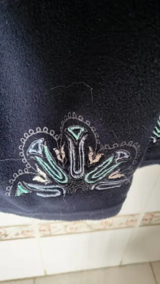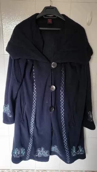 Abrigo de coralina con un diseño original y detalles bordados. - Color principal negro con toques de azul verdoso. - Cierre de botones. - Bordados decorativos en mangas y bajo.