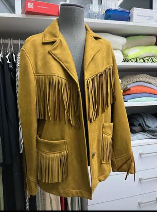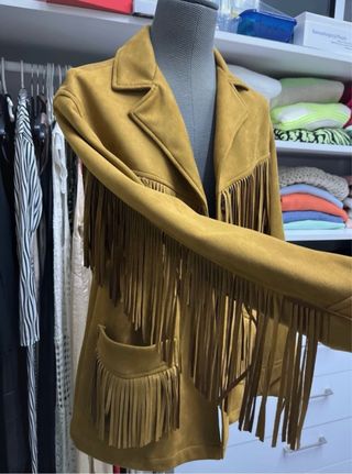 Chaqueta de ante con un diseño único y detalles de flecos. Color mostaza - Estilo western. - Cierre de botón. - Bolsillos delanteros con flecos. - Flecos decorativos en el pecho y espalda.