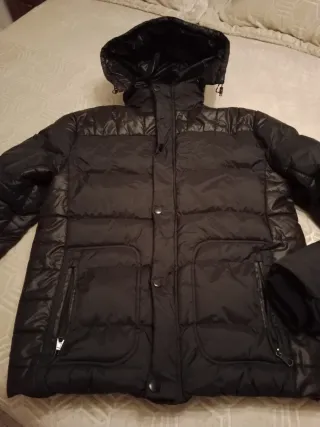 Chaqueta acolchada de hombre con capucha desmontable con cremallera. Cierre de cremallera y broches de presión. Puños con elástico. Bolsillos con cremallera. La cremallera del bolsillo derecho no cierra.
