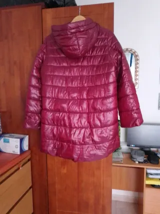 El color granate tiene un brillo precioso (en persona se ve aún mejor). Talla: 2XL Precio en tienda: 150€ Medidas: • Hombros: 50 cm • Contorno: 61 cm • Largo: 97 cm Perfecto para los días fríos. Lleva capucha desmontable. Estado: Nuevo con etiquetas.